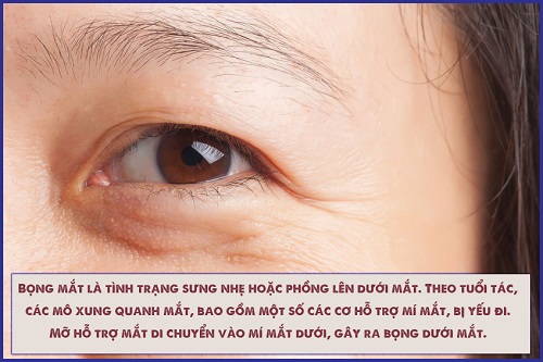 >> Bọng mắt là tình trạng sưng nhẹ hoặc phồng lên dưới mắt. Theo tuổi tác, các mô xung quanh mắt, bao gồm một số các cơ hỗ trợ mí mắt, bị yếu đi. Mỡ hỗ trợ mắt di chuyển vào mí mắt dưới, gây ra bọng dưới mắt.